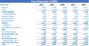 Once we have created income and expense projections for our interior design business plan, we can move on to checking the profit and loss (P&L) and understanding the profitability of our business. The P&L statement will show us the income we generated and the corresponding expenses we incurred. This will allow us to visualize our “profitability” such as gross profit or EBITDA margin.