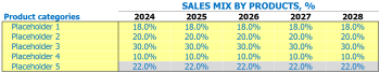 Let’s take a look at the sales mix by product category assumptions. For example, you might have five product categories: furniture, lighting, rugs, accessories, and artwork. You can enter the percentage sales mix for each of the five years of your forecast for each product category.